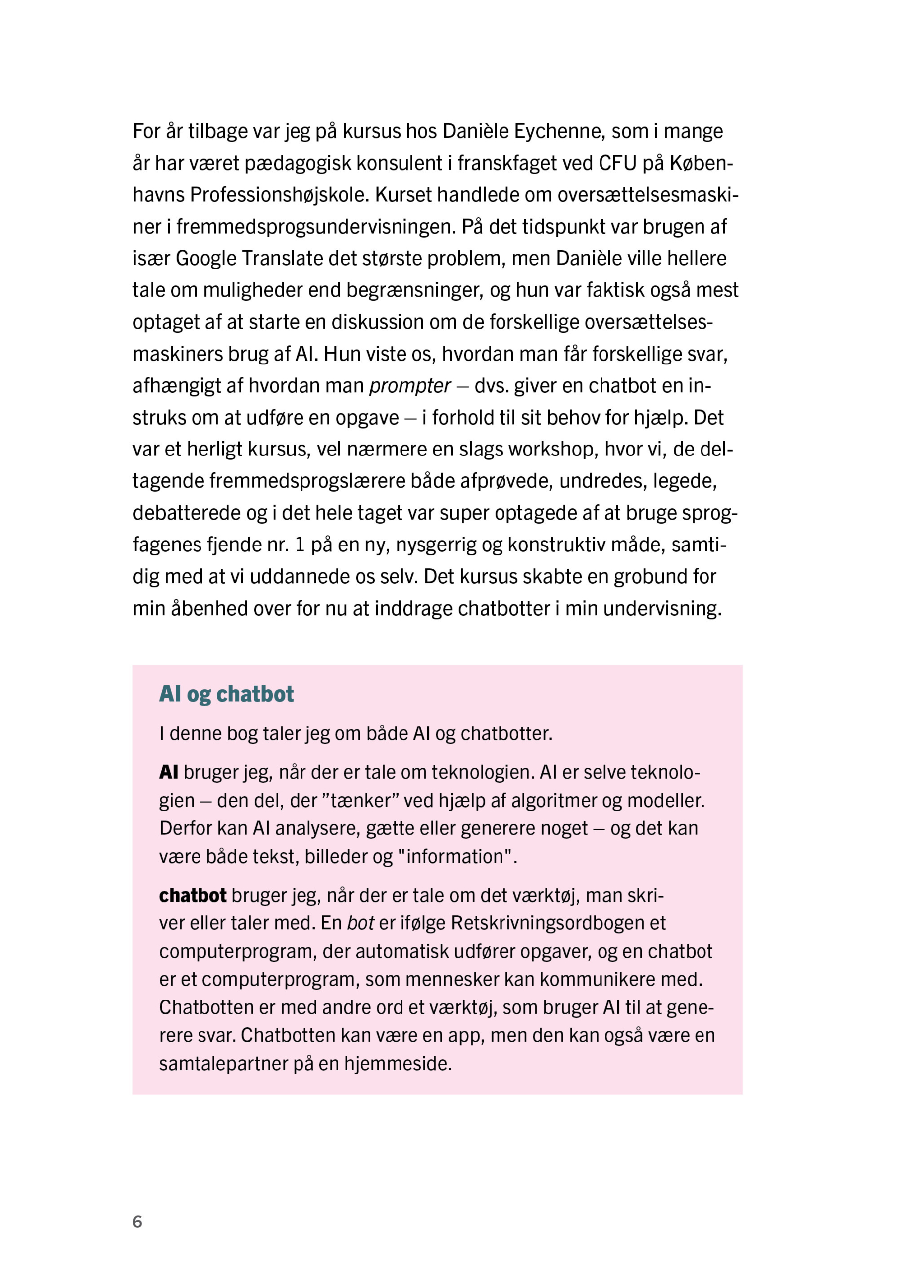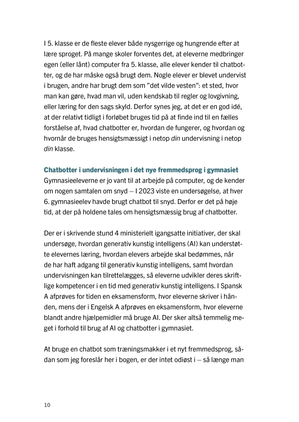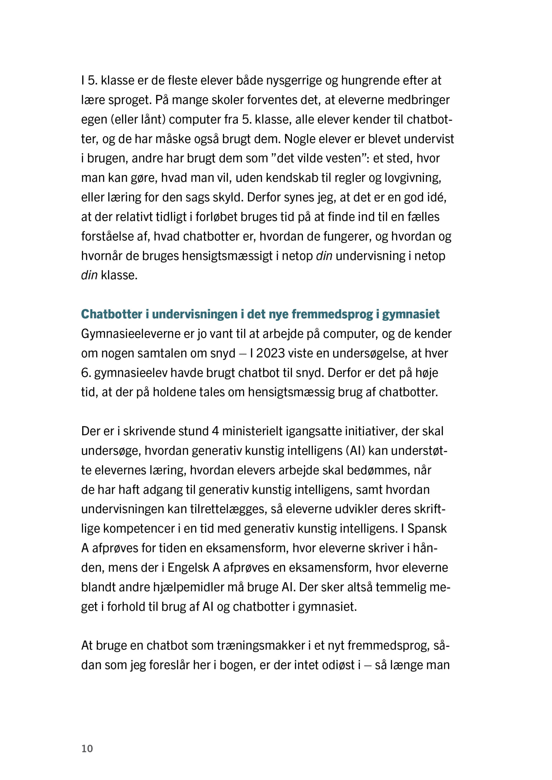 Bogen er skrevet med afsæt i et kommunikativt, funktionelt sprogsyn, hvor sprogtilegnelse forstås som noget, der sker gennem brug. Eleverne skal have mod på at kaste sig ud i kommunikationen, opleve, at de kan gøre sig forståelige, og gradvist opbygge tillid til egne sproglige evner. Her kan chatbotten fungere som en træningsmakker, der giver eleverne mulighed for at øve sig i et trygt rum, med gentagelser, støtte og tempo tilpasset den enkelte.