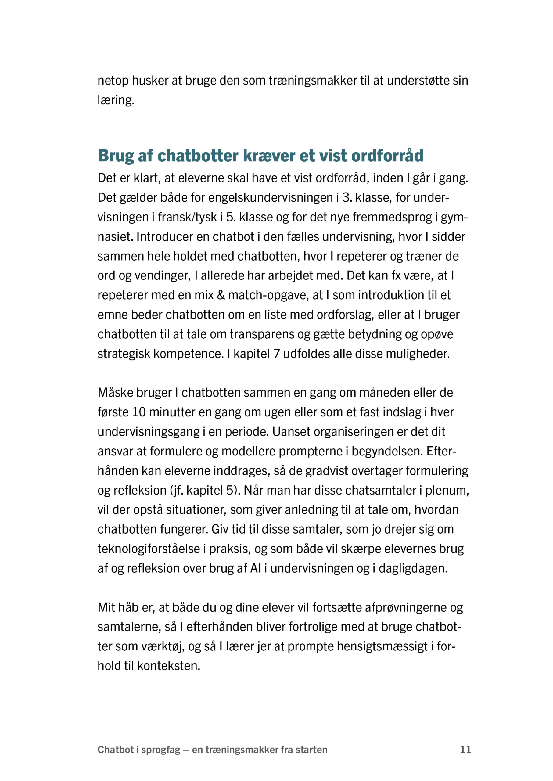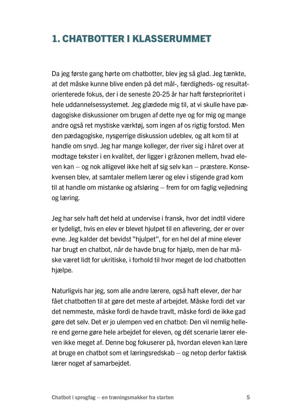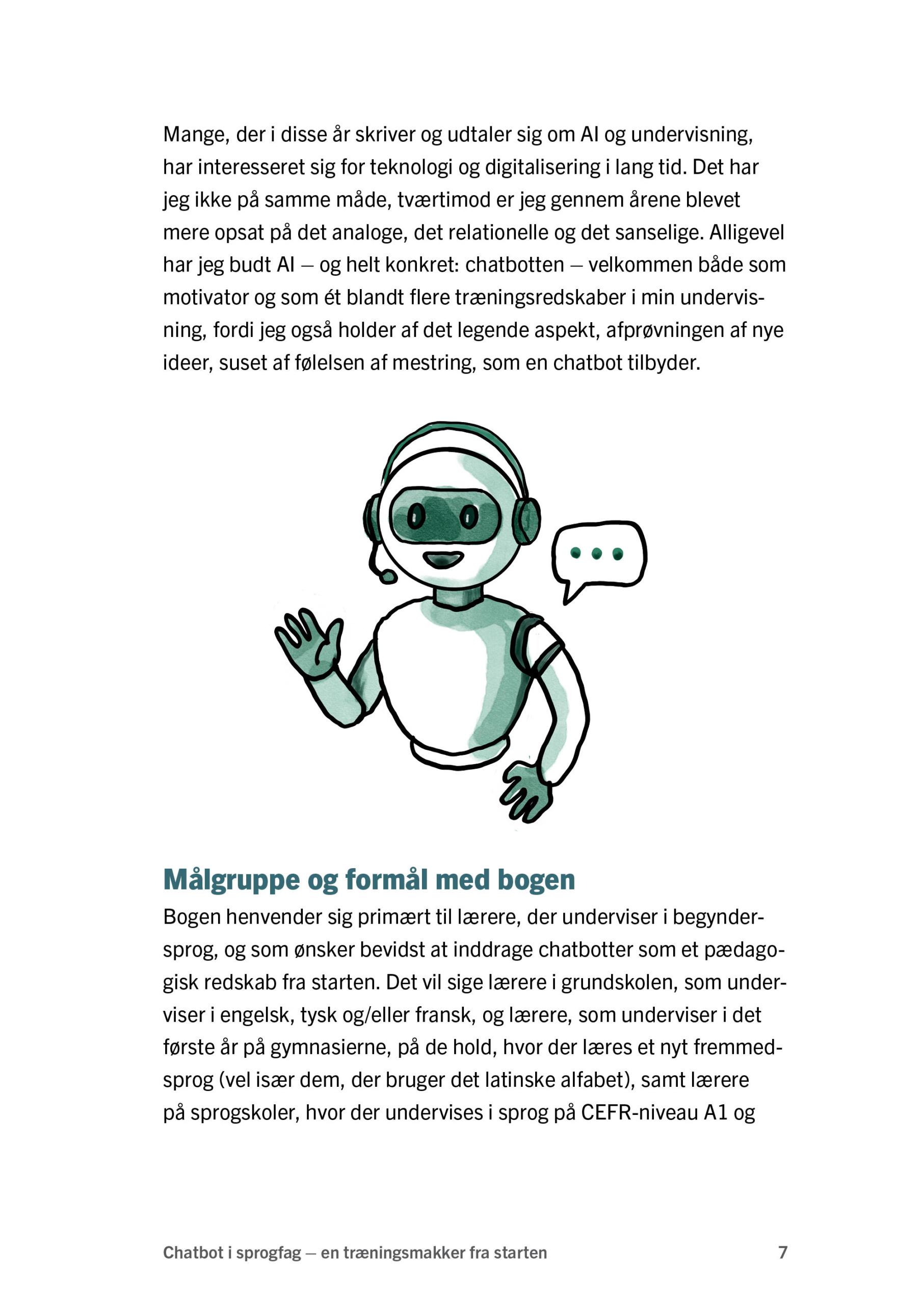 Chatbot i sprogfag – en træningsmakker fra starten er en fagbog til lærere, der ønsker at arbejde undersøgende, ansvarligt og pædagogisk med AI – med fokus på sproglig læring, elevdeltagelse og tillid til egne evner.