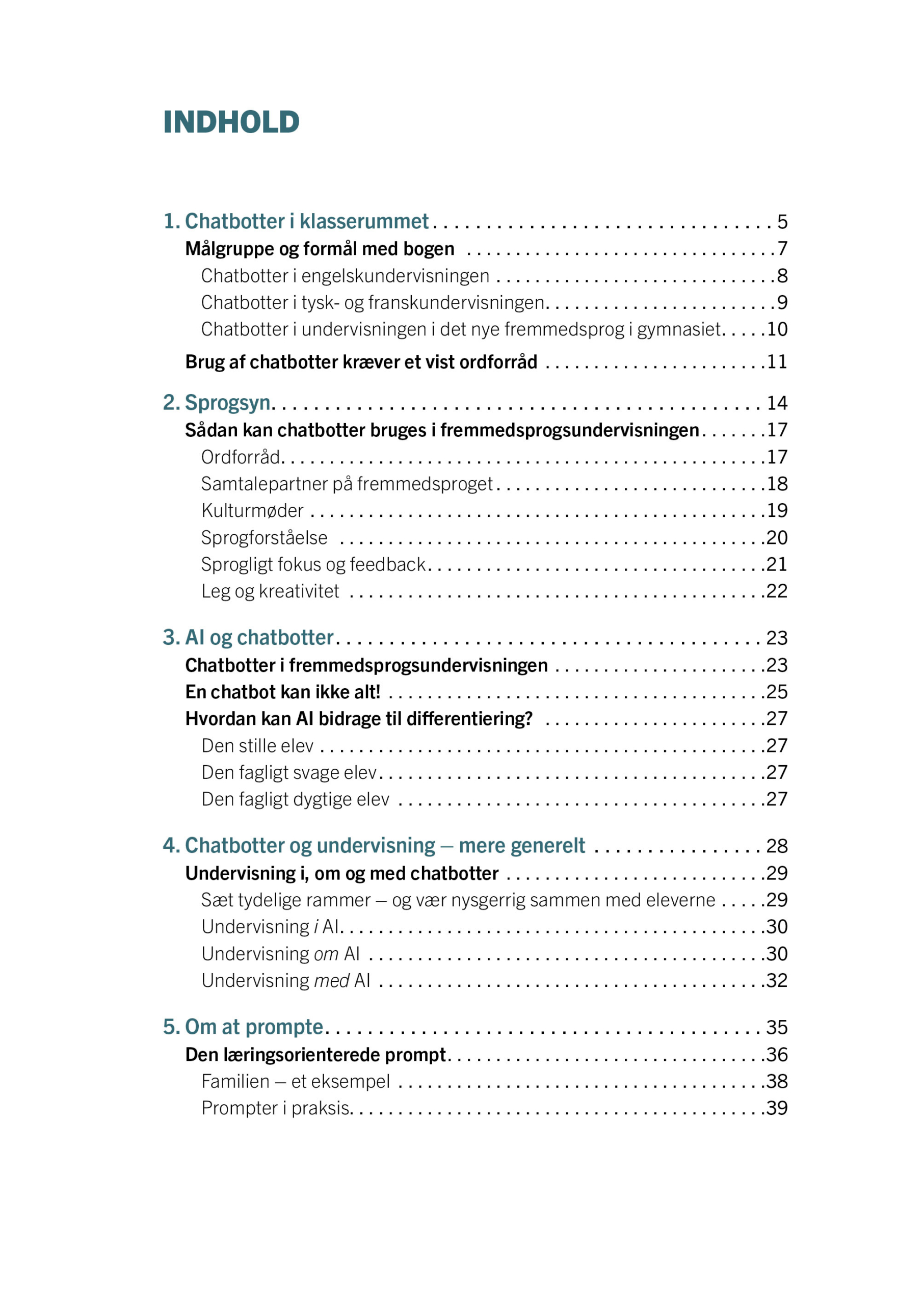 Et centralt fokus er derfor differentiering. Chatbotten kan give den stille elev mulighed for at deltage uden at være eksponeret for hele klassen, den fagligt svage elev kan få gentagelser og støtte uden tidspres, og den fagligt stærke elev kan udfordres på sit niveau. Bogen viser, hvordan disse muligheder kan indgå i en fælles didaktisk ramme, hvor læreren fortsat sætter retning og mål for undervisningen, og hvordan eleverne gradvist kan inddrages i at reflektere over både prompter og svar.