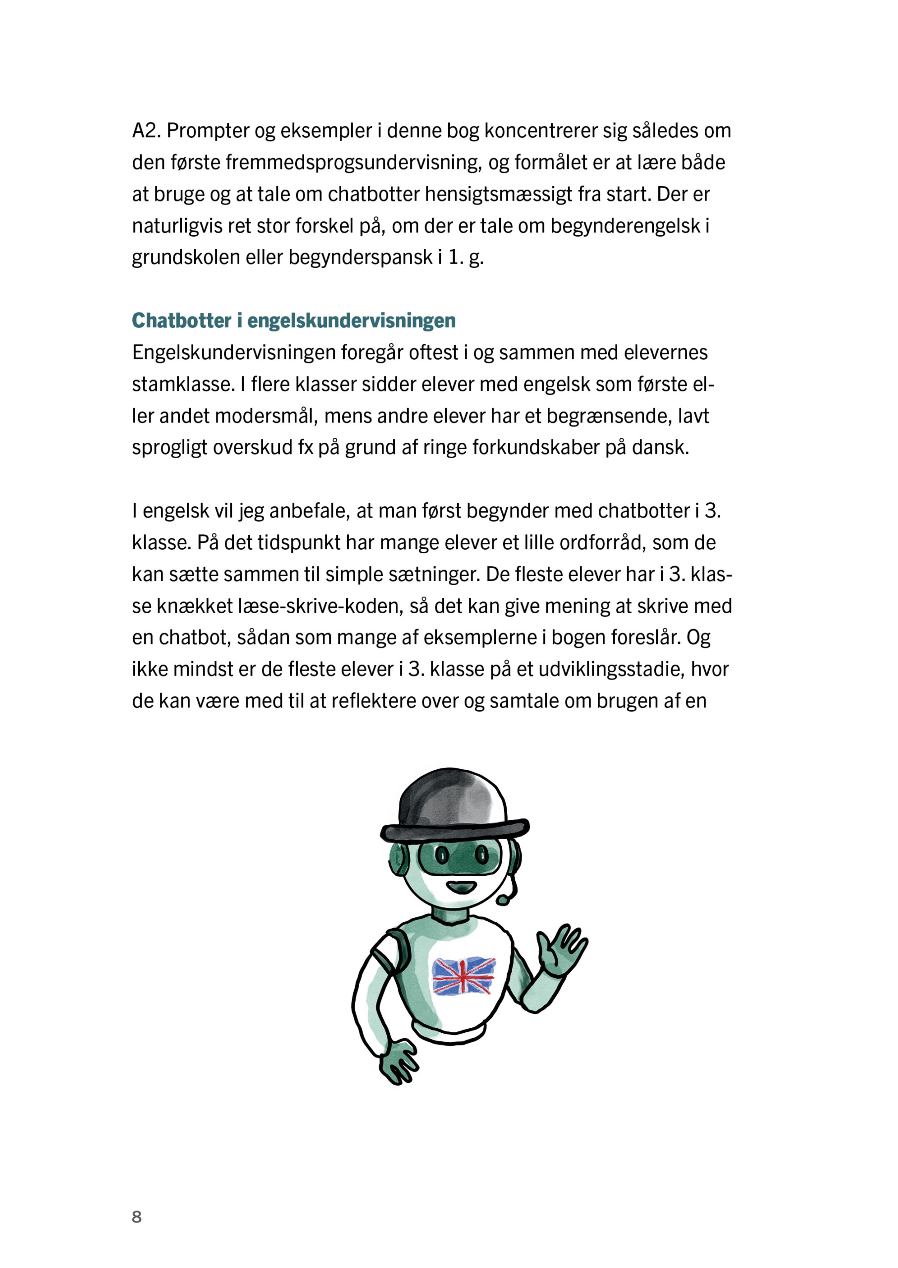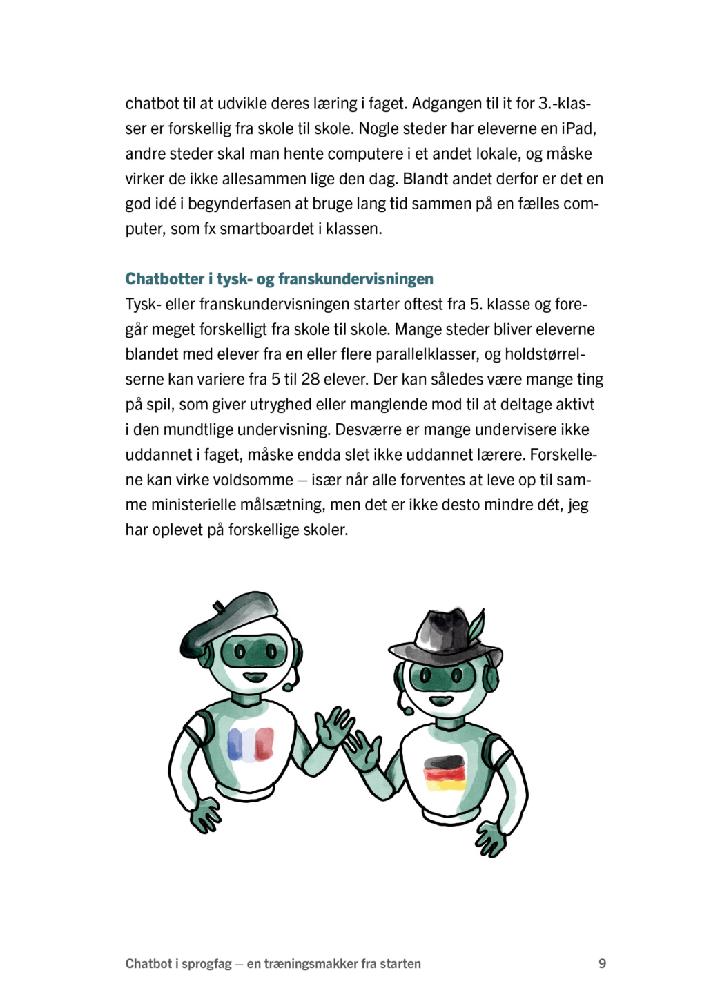 I bogen vises det, hvordan chatbotter kan anvendes som supplement til den daglige undervisning – ikke som erstatning for læreren eller for det relationelle arbejde i klassen. Chatbotten kan bruges til ordforrådstræning, korte samtaler, interview, rollespil, kulturmøder og sproglig leg. Gennem konkrete eksempler og opgavetyper gives der inspiration til, hvordan eleverne kan arbejde aktivt med sproget fra begyndelsen, både skriftligt og mundtligt.