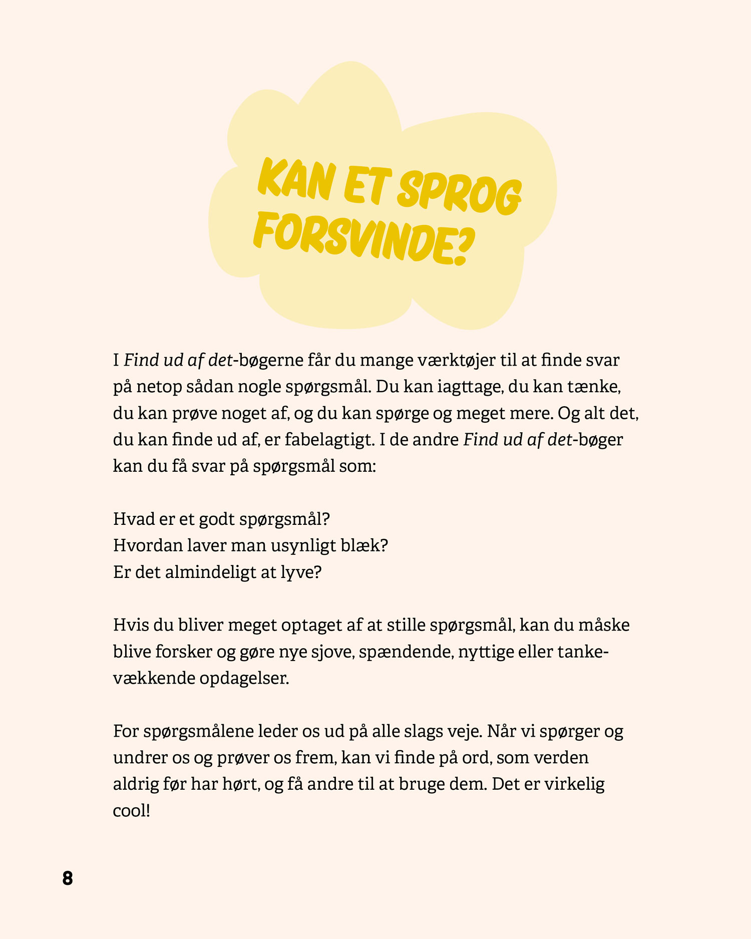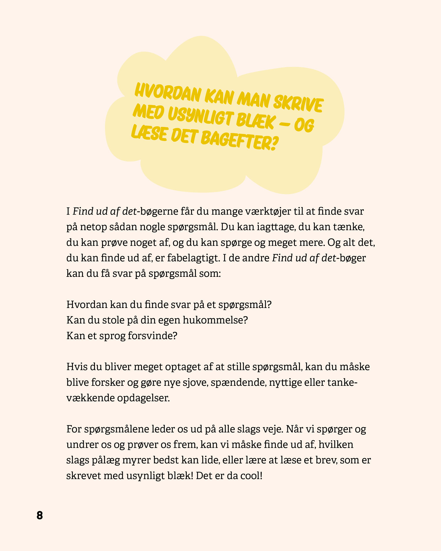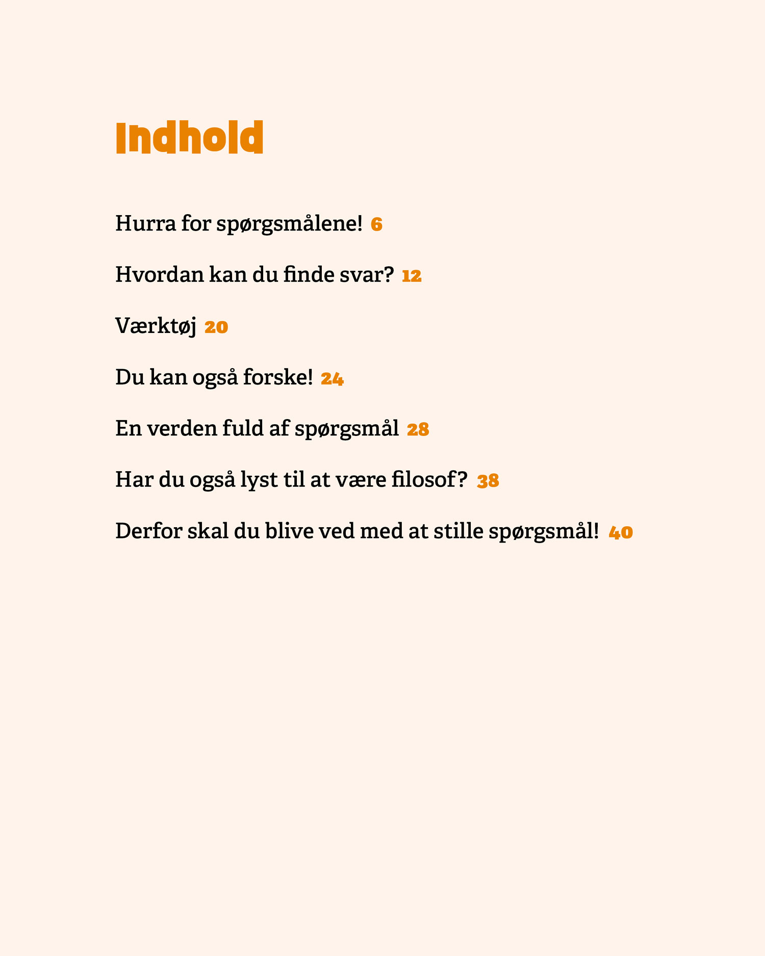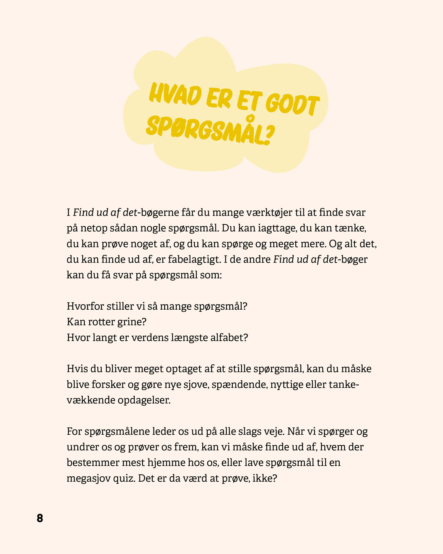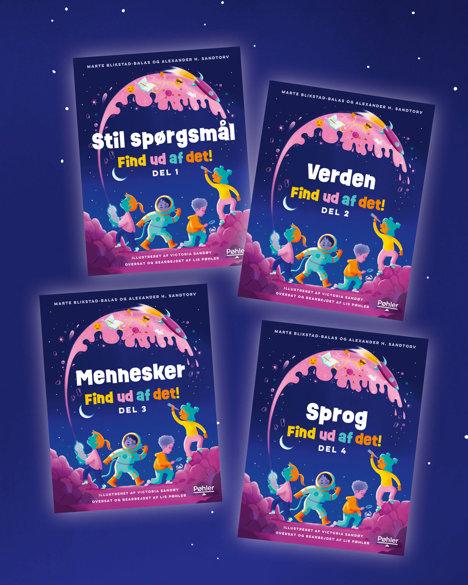 Serien består af fire bøger – Stil spørgsmål, Verden, Mennesker og Sprog – som hver især giver eleverne konkrete metoder til at stille gode spørgsmål, afprøve undersøgelser og reflektere over resultater. De fire bøger kan læses uafhængigt af hinanden.