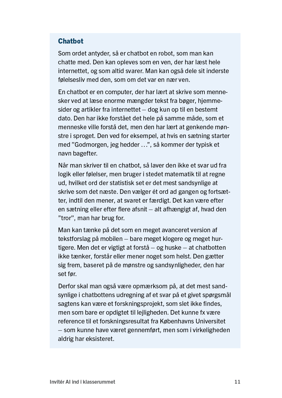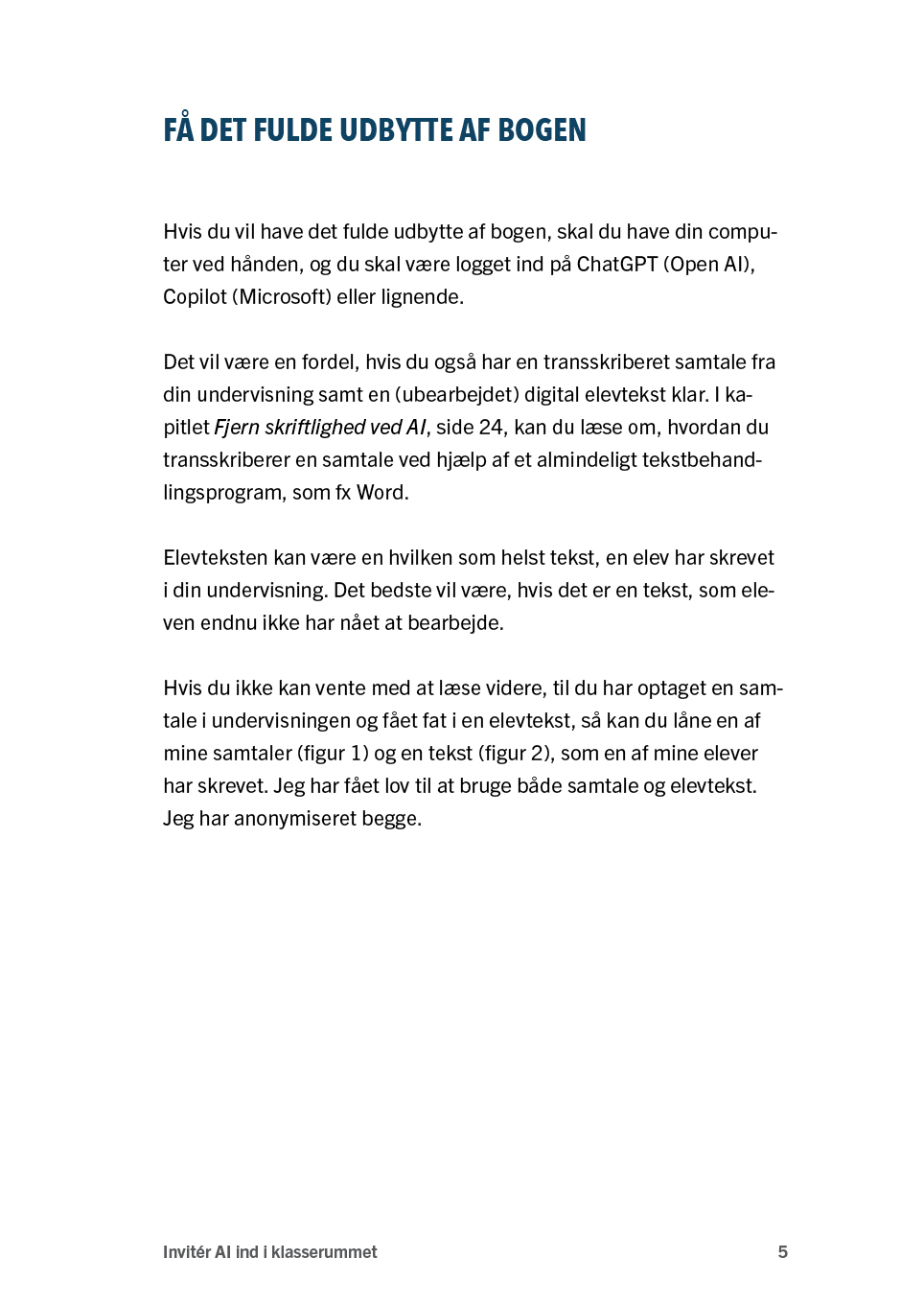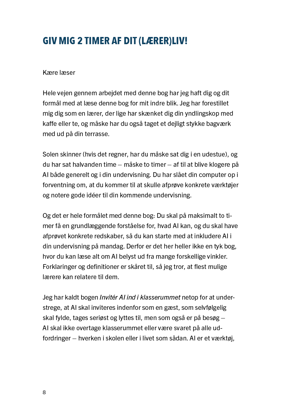 Invitér AI ind i klasserummet er skrevet med henblik på, at andre lærere på maksimalt to timer dels får en grundlæggende forståelse for, hvad AI kan, og dels får afprøvet konkrete redskaber – i håbet om, at lærerne både kan og vil inkludere AI i egen undervisning allerede fra på mandag.