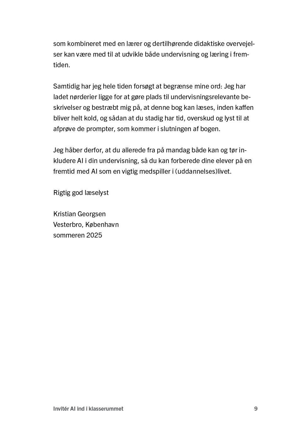 Invitér AI ind i klasserummet viser i et letforståeligt sprog, hvordan vi kan bruge AI på en måde, der gavner vores elever – uden at de mister evnen til selv at tænke, skrive og regne. Bogen er skrevet af Kristian Georgsen, der til daglig er lærer på en efterskole for ordblinde elever.